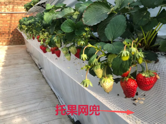 草莓第1茬花开放前,在每行草莓两侧安装托果网兜,托果网兜用卡子固定,每隔3m安装1个果网托架。安装时注意拉紧托果网兜的两侧,以保证网兜在草莓结果后可以托起果实,防止果柄折断。托果网兜还有利于果实表面通风,增加果实硬度,降低果实周围湿度,从而防止病害发生。