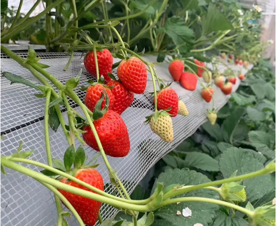 黑白双色地膜覆盖栽培架,能保持草莓栽培网兜周围空气湿度,降低棚内空气湿度,为草莓根系增温。